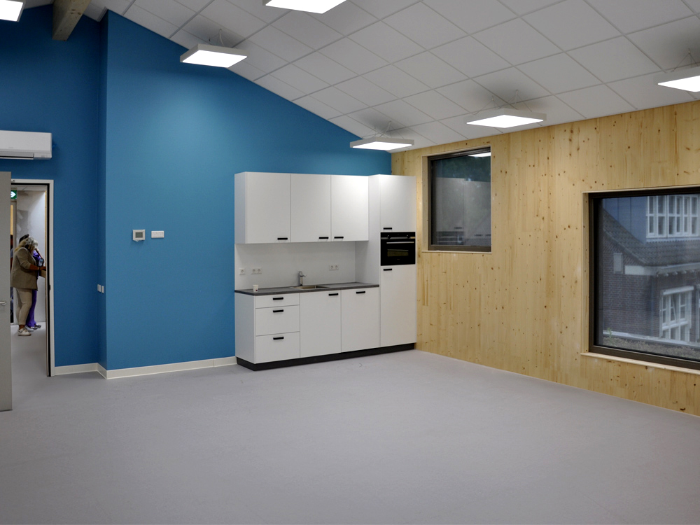 Dit is natuurlijk een mooie mijlpaal om samen met betrokkenen te vieren. De fruitschaal van rest hout is een cadeautje voor de kinderen en medewerkers in dit gezonde gebouw. Nu gaat Kosmo verder met de duurzame inrichting van het pand. Op 31 augustus is de grote vrolijke opening gepland.