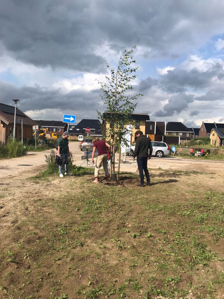En wat doe je dan om de oplevering te vieren? Dan planten we samen met een bewoner een boom in de tuin. Bij elk project geven wij de natuur twee bomen terug voor elke boom die wij gebruikt hebben voor de bouw ervan. Een aantal op de kavels en de rest in samenwerking met Trees4All. Toen de boom stond, was het tijd voor een hapje en drankje en een rondje door de woning van één van de huurders. Dat trok heel wat bekijks. Vooral het vele hout in de woning valt in de smaak. De huurster is ondertussen heel blij dat ze nu in haar dorp ook duurzaam kan wonen.
