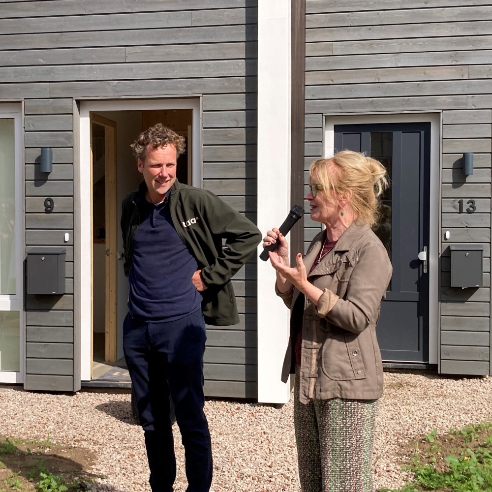 Tijd voor een feestje! De laatste huurders kregen woensdag 30 augustus de sleutel van onze biobased woningen in Olst. Dat hebben we samen met alle bewoners, onze opdrachtgever SallandWonen, onze bouwers en anderen gevierd. Want dit is voor alle betrokkenen een bijzonder project. De sociale huurwoningen zijn 90% biobased, van natuurlijke hergroeibare materialen, en daarmee next level duurzaam. Gemaakt in onze fabriek op 9 kilometer afstand. Zo kan het ook!