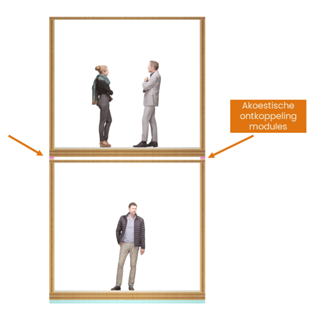 Elke module heeft een vloer én een plafond. Tussen het plafond van de ene module en de vloer van de volgende zit een dempende rand. Samen met de geïsoleerde tussenruimte absorbeert deze rand al het contactgeluid. Dat noemen we akoestische ontkoppeling.