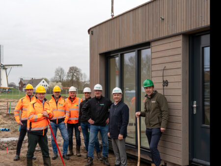 Wethouder Gerard Nijland van de gemeente Montferland en directeur-bestuurder Arjan ter Bogt van Plavei maakten op dinsdag 17 maart van dichtbij mee hoe snel je huizen kunt bouwen.